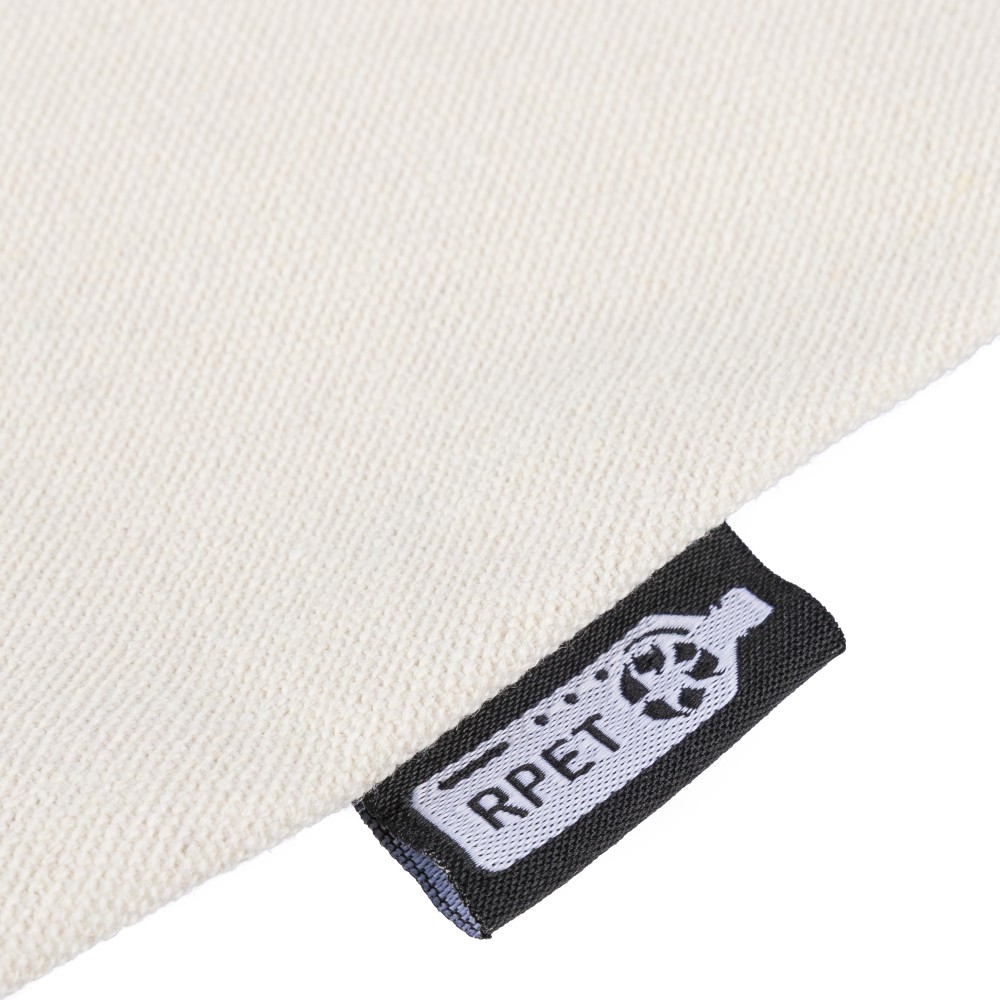 Újrahasznosított pamut-poliészter, 330 g/m2 kevertszövetből készült bevásárlótáska nagy, cipzáras felső rekesszel, 65 cm hosszúságú és 2,5 cm szélességű hosszú fülekkel, a táska színével harmonizáló hevederrel. Külső felületén rPET címkével, belső részén további címkével ellátva.