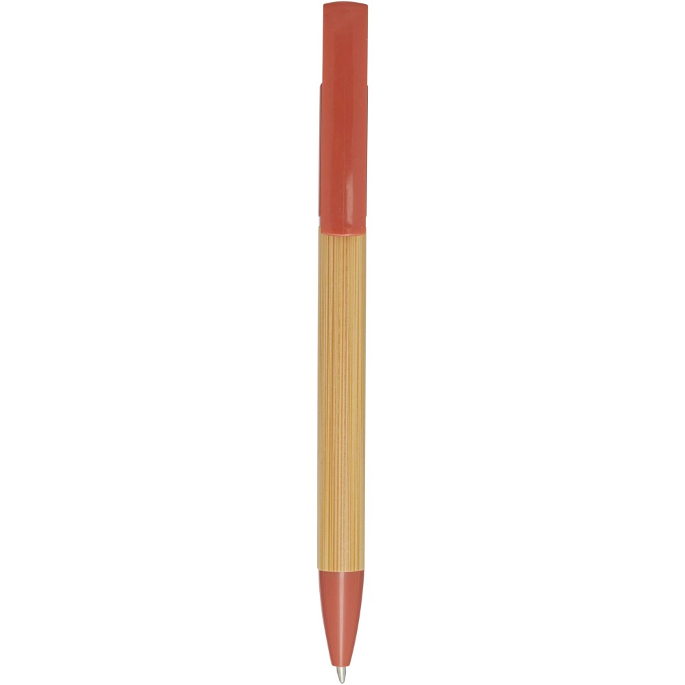 Bambusz golyóstoll, amely telefontartóként is funkcionál. A gomb és a középső gyűrű újrahasznosított műanyagból, a hegy rézből, a tollteste pedig felelősen beszerzett bambuszból készült. Fekete tollbetéttel. Írási hossz: 1000 méter. Tollhegy mérete: 1,0 mm.