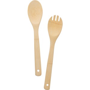 Bambusz salátás evőeszköz. Az evőeszközök nyelének végén lyukakkal van ellátva. Pamut zsinórral húzható tasakba csomagolva érkezik.