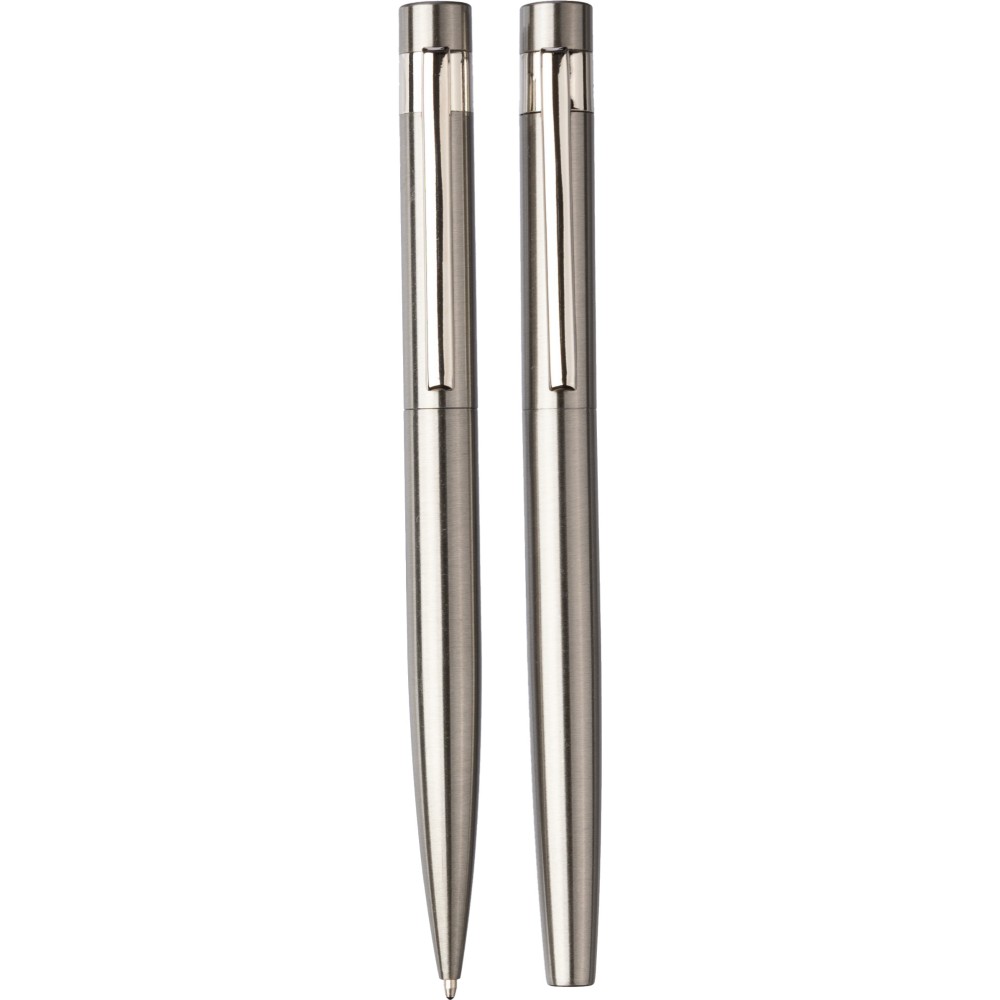Újrahasznosított rozsdamentes acél tollkészlet, amely egy csavaros mechanikával rendelkező golyóstollat és egy rollerball tollat tartalmaz, mindkettő kék tollbetéttel érkezik. Mindkét toll hátoldalán az újrahasznosított rozsdamentes acél alapanyagot jelző logó található. Csomagolása nátronpapír díszdoboz.