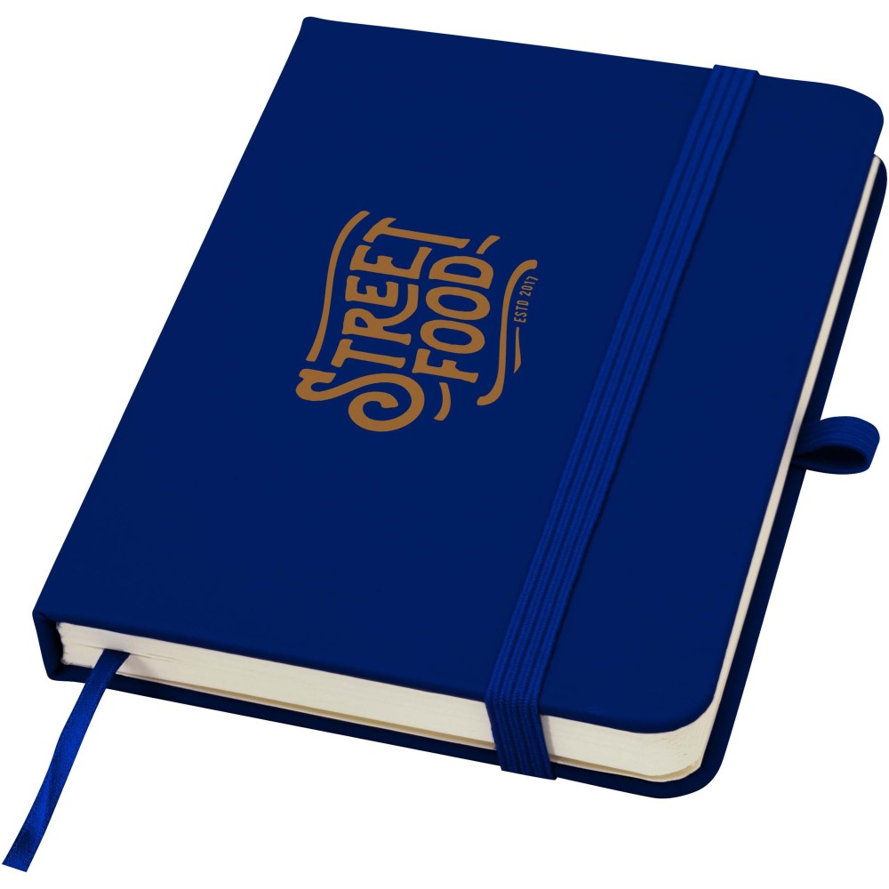 A Spectrum Plus A6 keményfedeles jegyzetfüzet lekerekített sarkokkal nemcsak az irodai mindennapok elengedhetetlen kelléke, hanem remek lehetőség márkád népszerűsítésére is. A jegyzetfüzet puha tapintású borítóval rendelkezik és 80 vonalas, krémszínű, 70 g/m2-es lapból áll, amely tökéletes gyors ötletek vagy hosszabb jegyzetek rögzítésére. A jegyzetfüzet tolltartó hurokkal, gumiszalagos záródással, könyvjelzővel és harmonikazsebbel van ellátva.