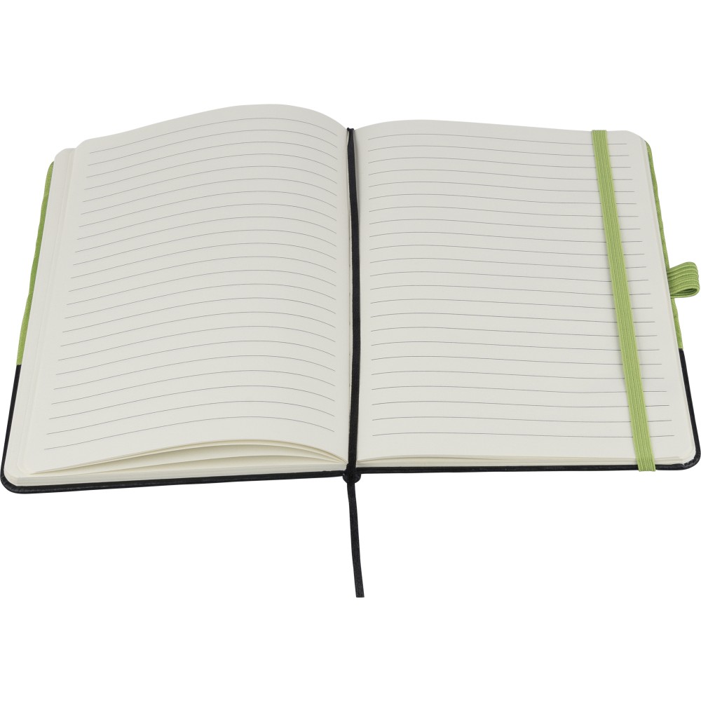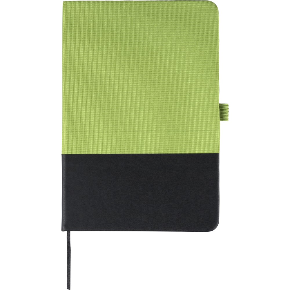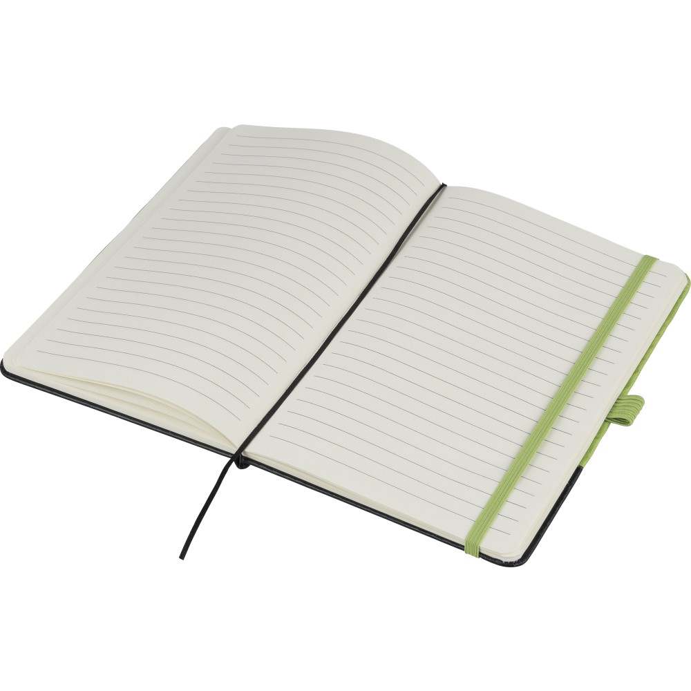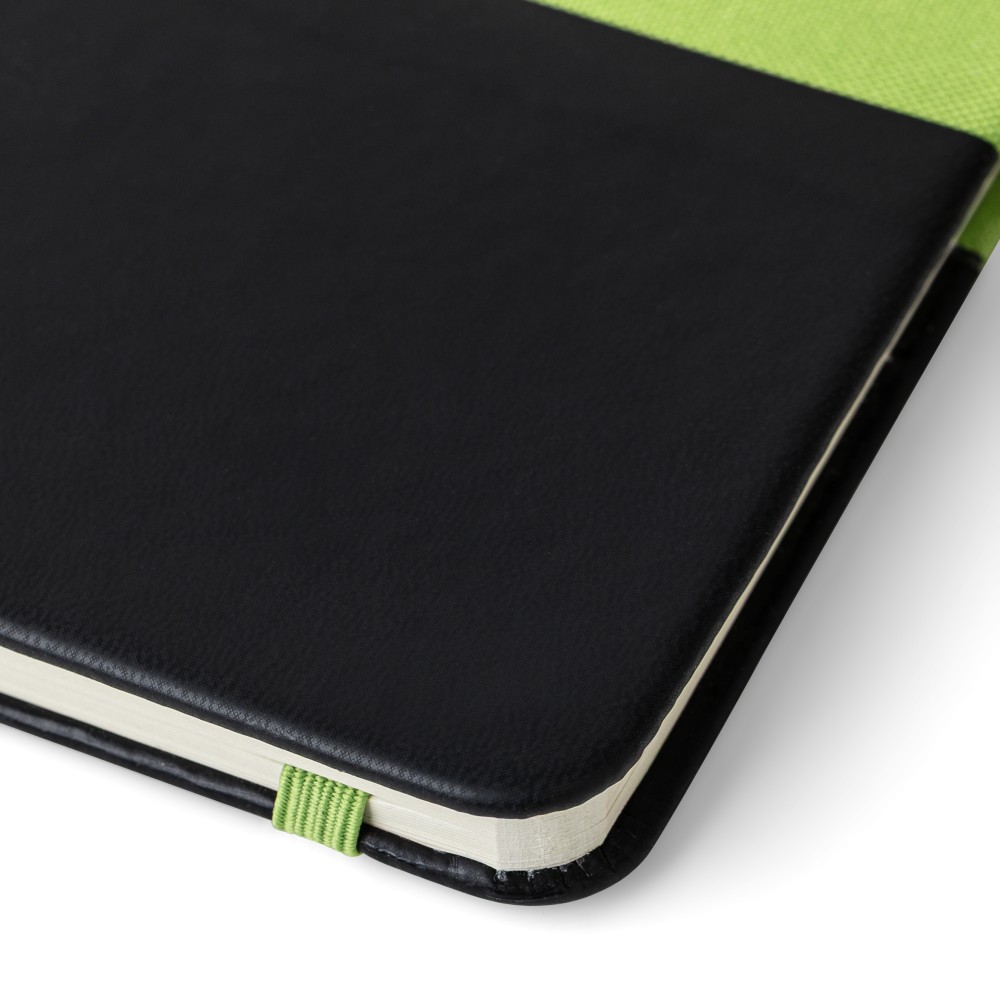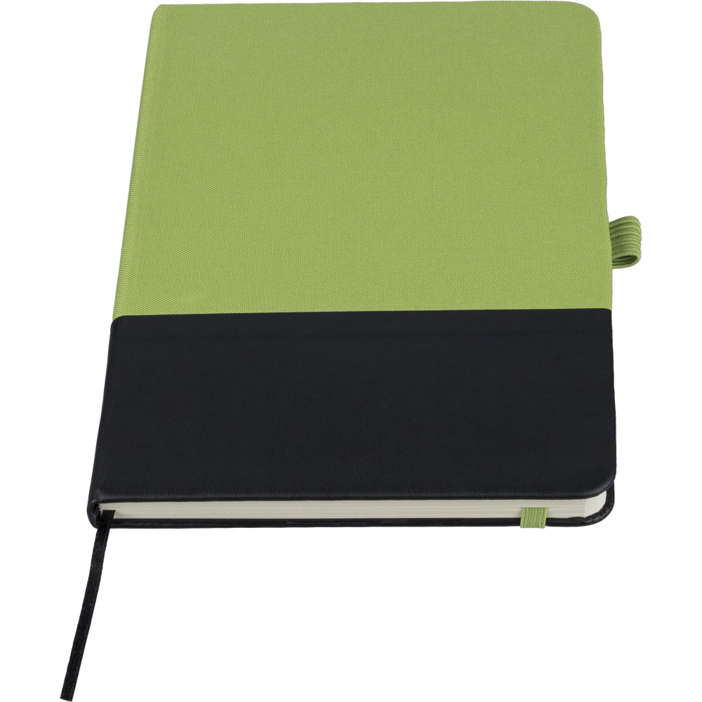 RPET poliészterből készült A5-ös jegyzetfüzet részben lézergravírozható PU előrésszel, amely gravírozás után a borító rPET anyagának színével egyező árnyalatot mutat. 80 lap 70 g/m2 vonalas papírt tartalmaz, gumipánttal, tolltartó hurokkal és könyvjelző szalaggal. Az alsó PU rész gravírozásra kialakítva, amely a megfelelő színt fedi fel.