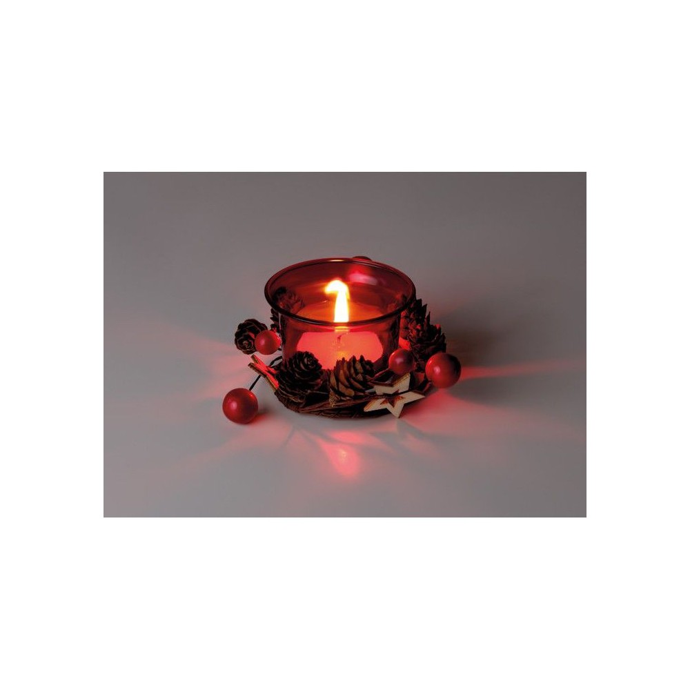 Díszekkel körbevett üveg mécsestartó. Karton és PVC ajándékdobozban, zsinórral átkötve, kis ajándékkísérő kártyával szállítjuk.