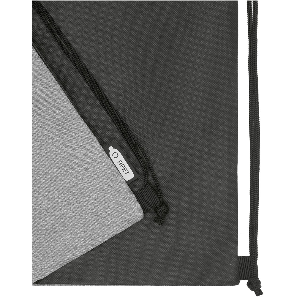 Tornazsák újrahasznosított RPET anyagból, fekete húzózsinórral, cipzáros zsebbel. Teherbírás 5 kg-ig. A termék színében kisebb eltérések lehetnek a festés, a szövés és a nyomtatás jellege miatt. 300D of újrahasznosított PET műanyag, újrahasznosított nemszőtt polipropilén, 80 g/m2.