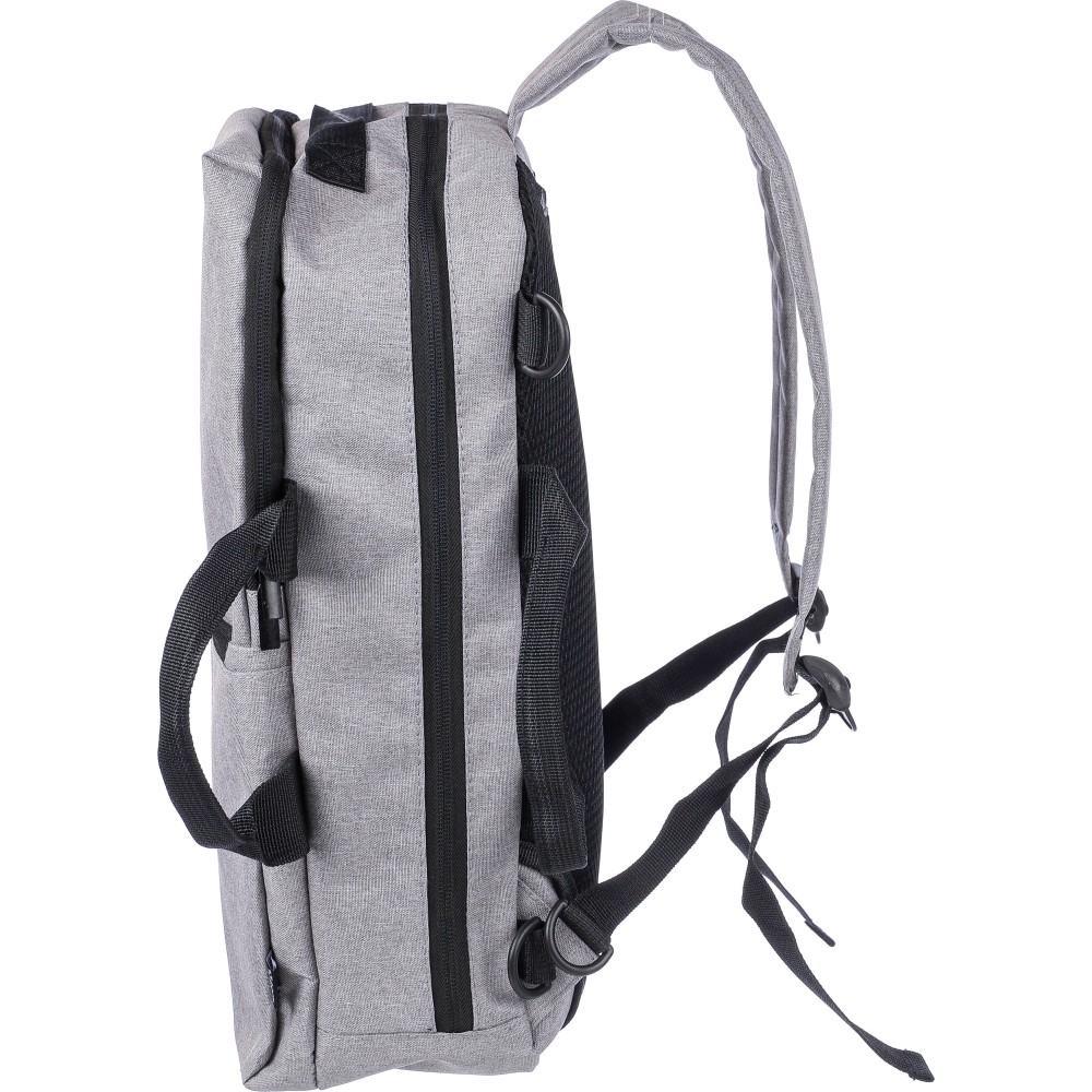 Hátizsák és laptoptáska 15"-es készülékhez. Kézipoggyász méretű. Hordozófüllel a tetején, állítható vállpántokkal és két oldalsó fogantyúval. Az állítható pántok a párnázás mögé rejthetők, így az oldalsó fogantyúkkal is hordozható. Tépőzáras laptoprekesszel és kis cipzáras zsebbel rendelkezik. Szellőző, párnázott hátoldallal. Terhelhetősége kb. 8 kg. RPET alapanyagra utaló címkével. Anyaga: 300D RPET poliészter.