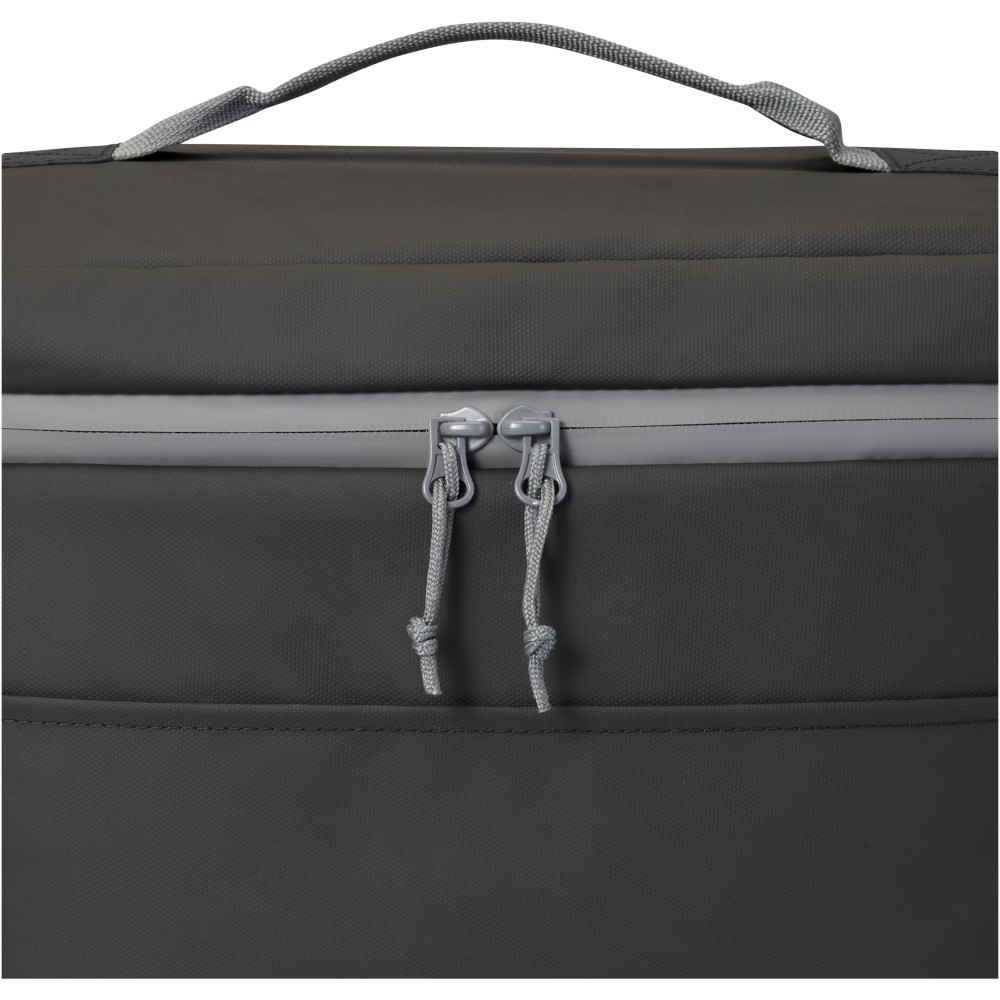 Vízálló 20 dobozos hűtőtáska, amely GRS tanúsítvánnyal rendelkező újrahasznosított anyagokból készült, beleértve a cipzárakat is. Tágas, cipzáras rekesszel rendelkezik, amely élelmiszer-biztonságos és extra vastag, nagy sűrűségű hőszigetelő PEVA és habszigeteléssel van bélelve, így az italok és frissítők órákig hidegen maradnak. Emellett 2 hálós zsebbel és egy nyitott elülső zsebbel rendelkezik további tárolási lehetőségként. A hevederes fogantyú és az állítható és párnázott vállpánt kényelmessé teszi a hordozást. A GRS újrahasznosított anyagai közé tartozik a főszövet, a bélés, a hevederek és a cipzárak. Nem mosható. Űrtartalom: 22 liter. PVC-mentes.