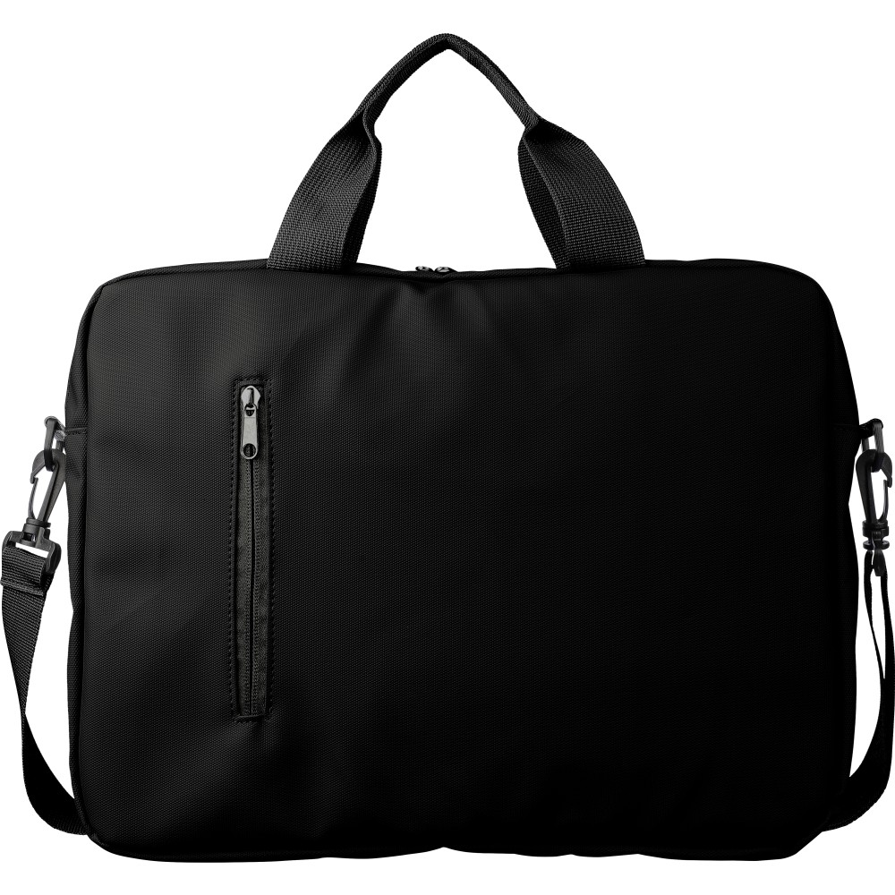 Laptoptáska 15"-es laptophoz PU anyagból, két cipzáras első zsebbel, egy nagy cipzáras rekesszel és tépőzáras laptop résszel, valamint több belső zsebbel. Állítható vállpántokkal és két fogantyúval rendelkezik. Vízlepergető. Anyaga: PU.