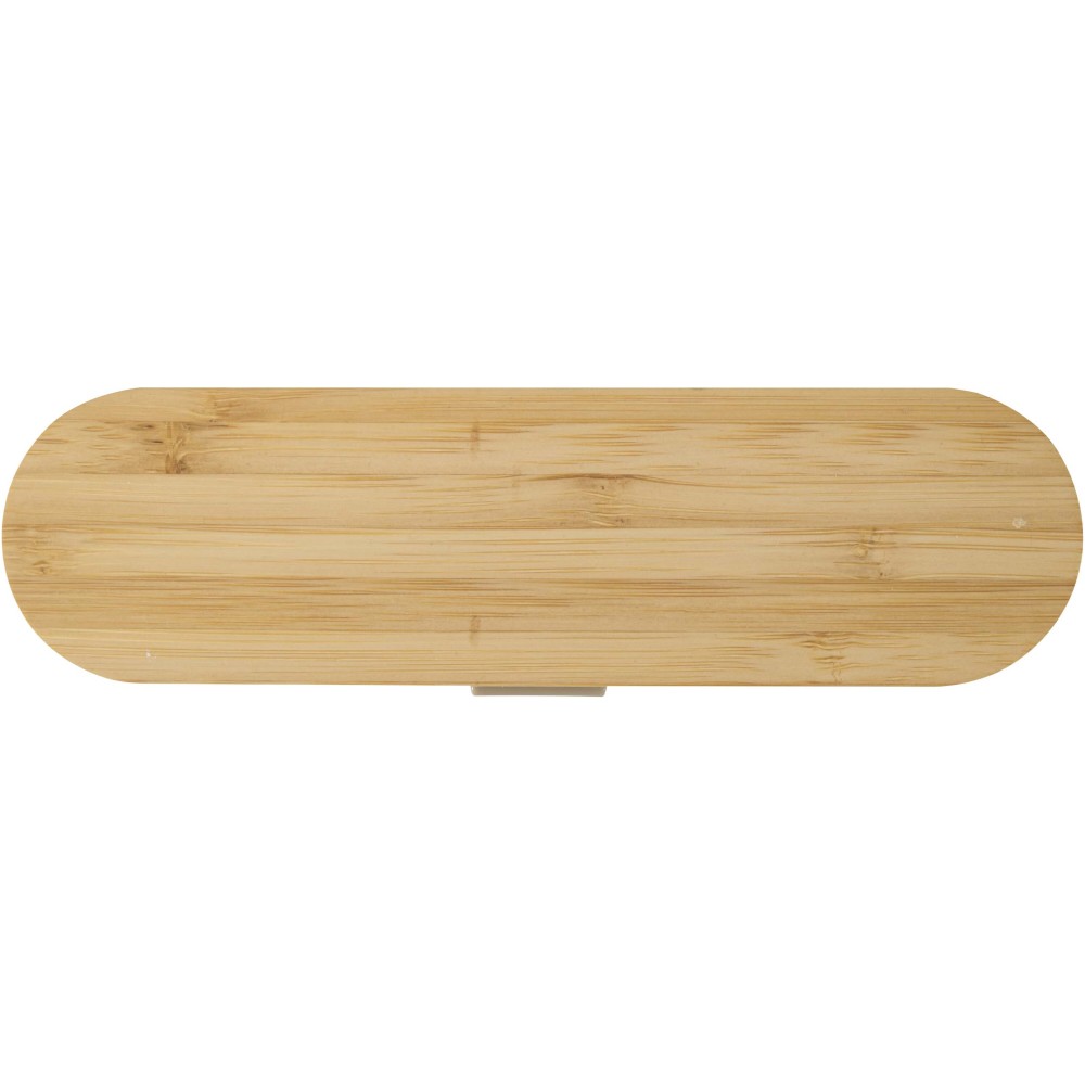 Újrafelhasználható evőeszközkészlet bambusz fedéllel, amely tartalmaz egy villát, kést, kanalat, szívószálat és egy szívószál tisztító kefét - ideális megoldást kínál az útközbeni étkezésekhez. Kompakt kialakításának és egyszerű tisztíthatóságának köszönhetően tökéletes kiegészítő uzsonnás dobozok mellé, utazáshoz vagy irodai használatra.