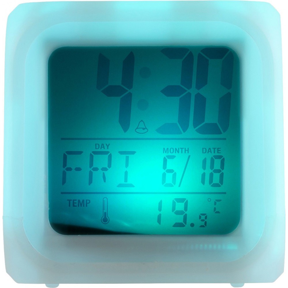 Kocka alakú ébresztőóra változó színű fénnyel. Funkciói: óra, naptár, hőmérő. Az elemet tartalmazza. HIPS műanyag.