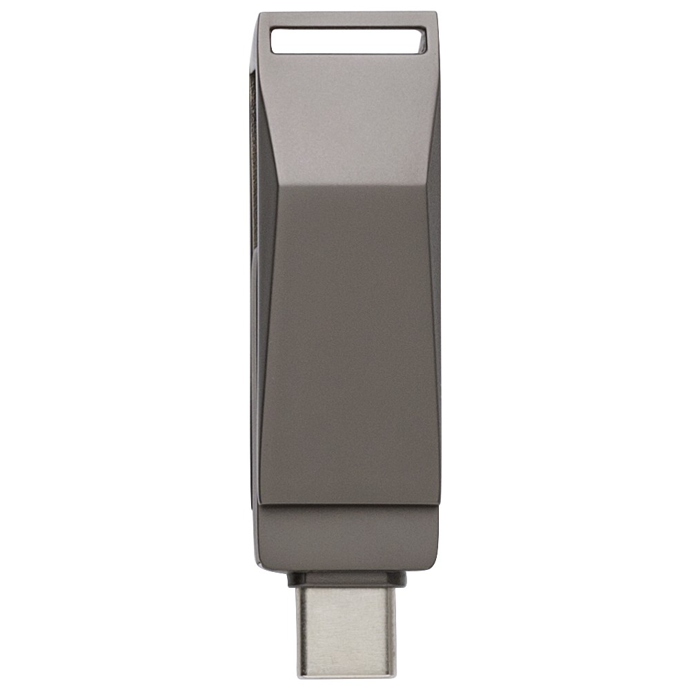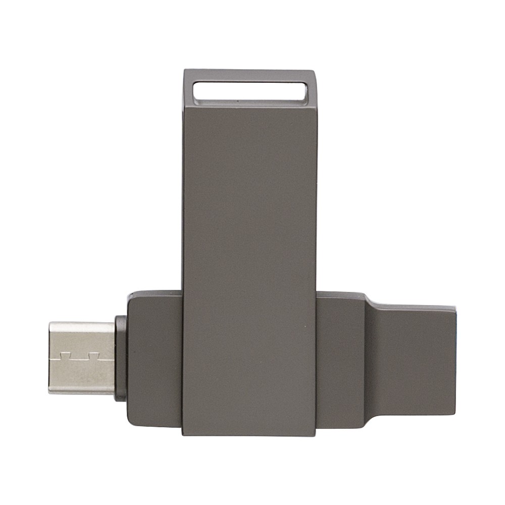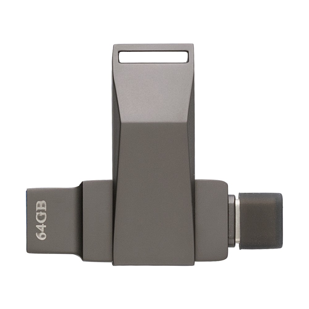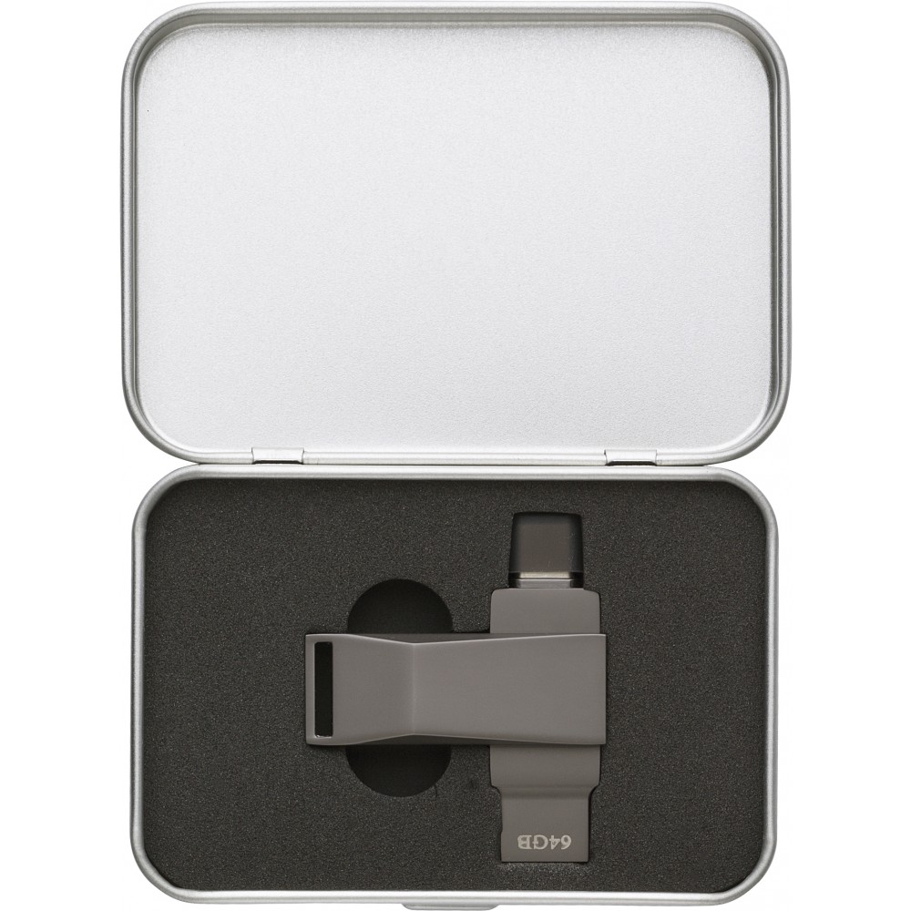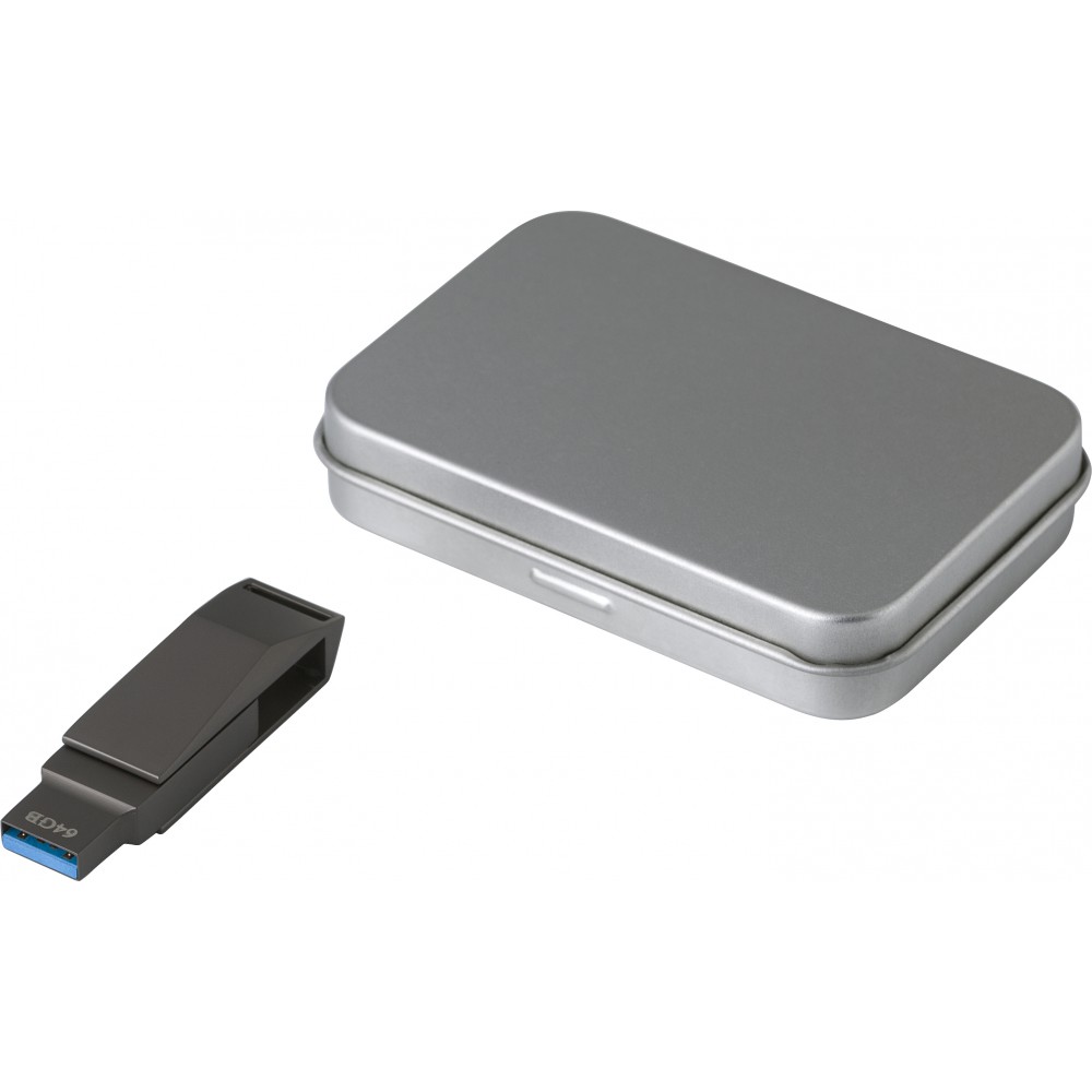 Pendrive 64 GB kapacitás, USB 3.0. USB-A és USB-C csatlakozóval. Csomagolása fém doboz.