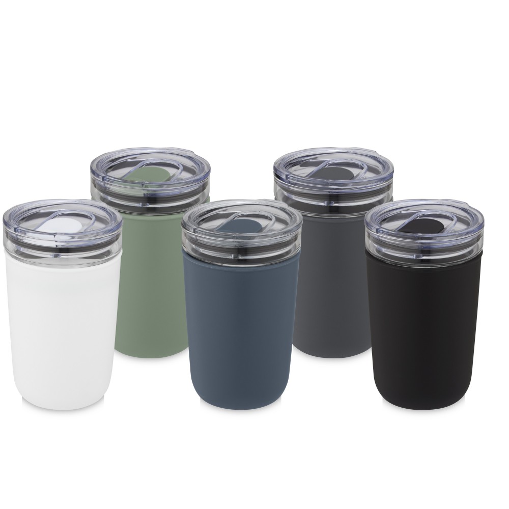 Újrahasznosított műanyag tokkal védett üvegpohár. A pohár 100%-ban tartós boroszilikát üvegből készült, amely megőrzi az ital frissességét, és nem tartalmaz semmilyen káros vegyszert. BPA-mentes, a német élelmiszerbiztonsági törvény (LFGB) szerint tesztelt és jóváhagyott. Ftaláttartalomra tesztelve és jóváhagyva a REACH előírásai szerint. A pohár a legtöbb kávéfőző alá illeszkedik. Nem szivárgásmentes. Szénsavas italokkal nem használható. Mosogatógépben mosható, de mikrohullámú sütőben történő melegítésre nem alkalmas. Űrtartalom: 420 ml. Újrahasznosított karton díszdobozban.