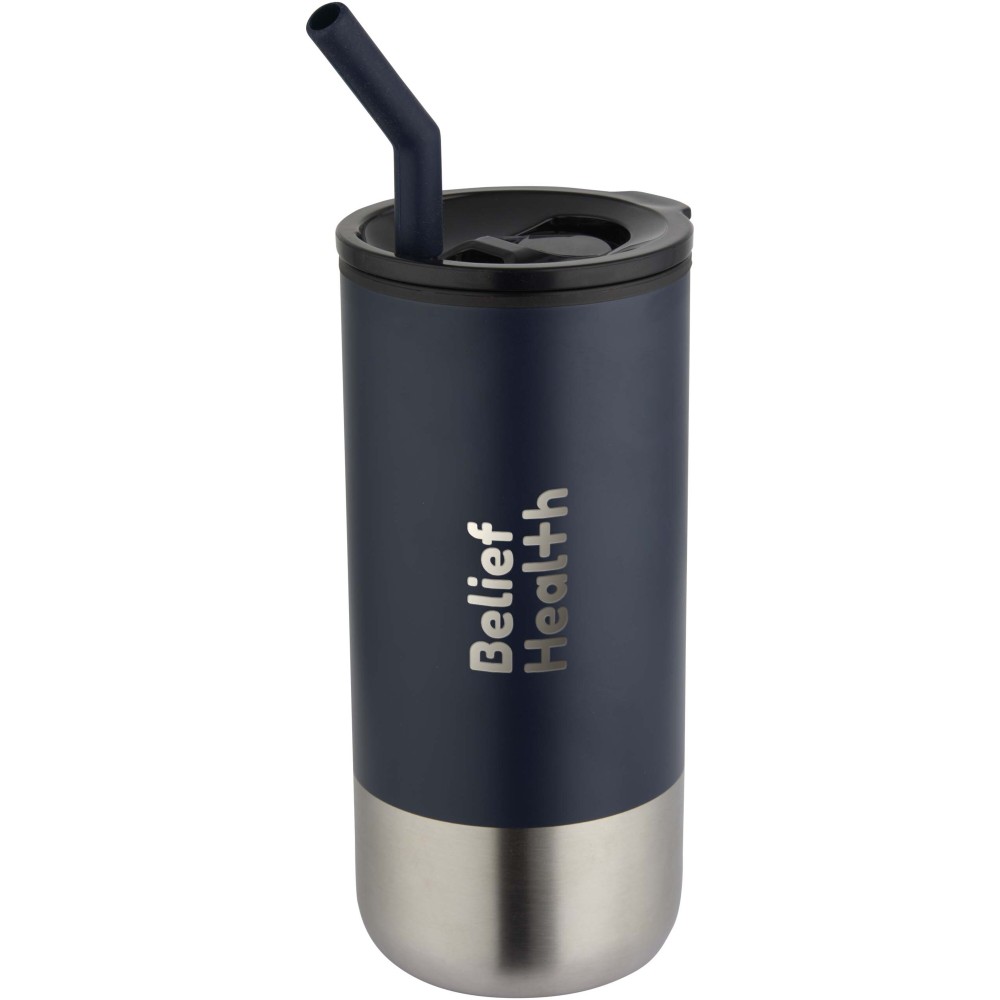 Ez a 480 ml űrtartalmú termoszpohár duplafalú, hőszigetelt kialakítással rendelkezik és egy szilikon véggel ellátott, újrahasznosított rozsdamentes acél szívószál tartozik hozzá a kényelmes használat érdekében. A belső fal PP műanyagból, míg a külső rész RCS tanúsítvánnyal rendelkező, újrahasznosított rozsdamentes acélból készült. A PS és ABS műanyagból készült csúsztatható fedél, valamint a matt külső bevonat elegáns megjelenést kölcsönöz a terméknek.