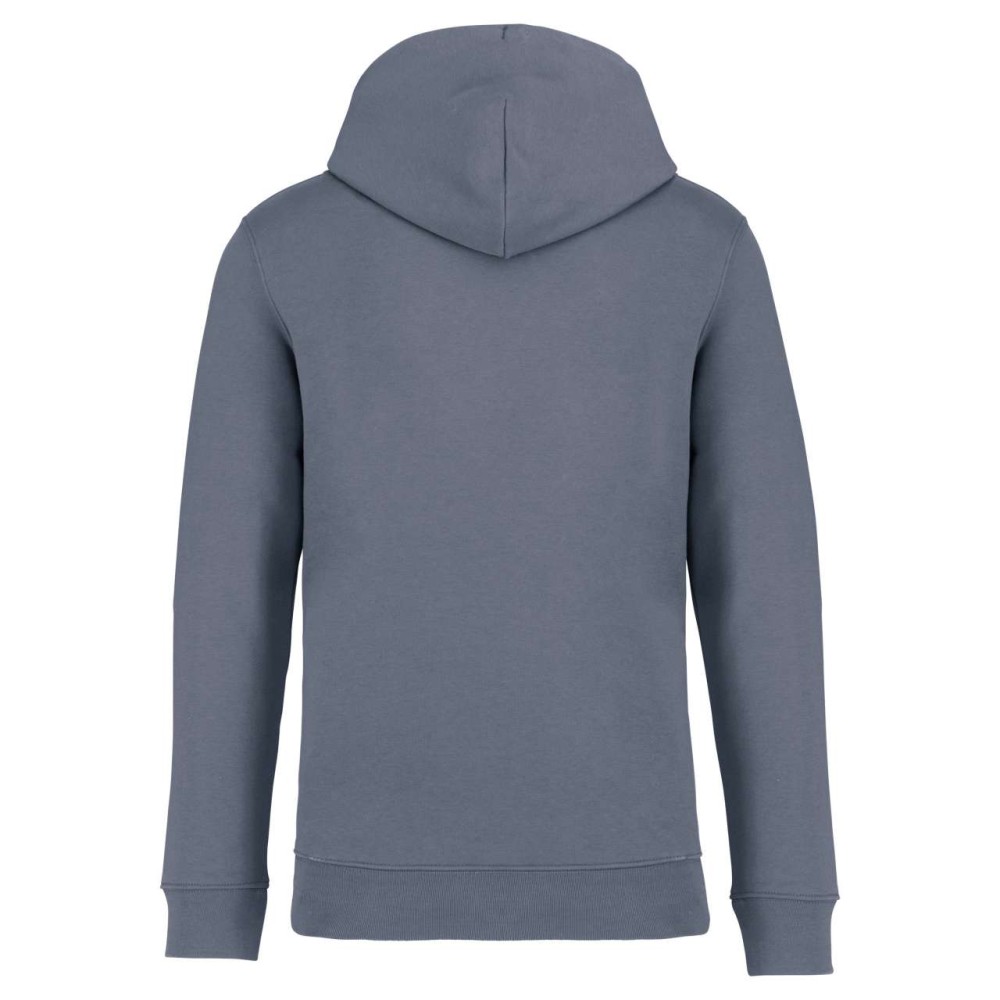 85 % bio, fésült pamutból és 15 % újrahasznosított poliészterből készült. Unisex. Egyenes szabás. Méretcímke organikus pamut és újrahasznosított poliészter logóval. LSF (Low Shrinkage Fleece: előzsugorított polár) kezelés. Kapucni. 1x1 bordás szegély és kézelő. Duplatűzés a kézelőn, a szegélyen és a nyaknál. Szalagozott nyakbelső hátul. Bélelt kapucni, a nyaknyíláson nincs felülvarrás, csak egy megkötés, hogy a húzózsinór a felső részen maradjon. Kerek húzózsinór a kapucnin fém véggel. Kenguru zseb. Nincs márkajelzés a nyakrészen, csak egy méretcímke a könnyű dekorálás érdekében. Karton függőcímkével érkezik, amely felsorolja a termék előállításához felhasznált környezetbarát anyagokat. Organikus pamutfonal. OEKO-TEX N CQ1007/7 STANDARD 100 tanúsítvánnyal rendelkezik. IFTH. 350 g/m2.