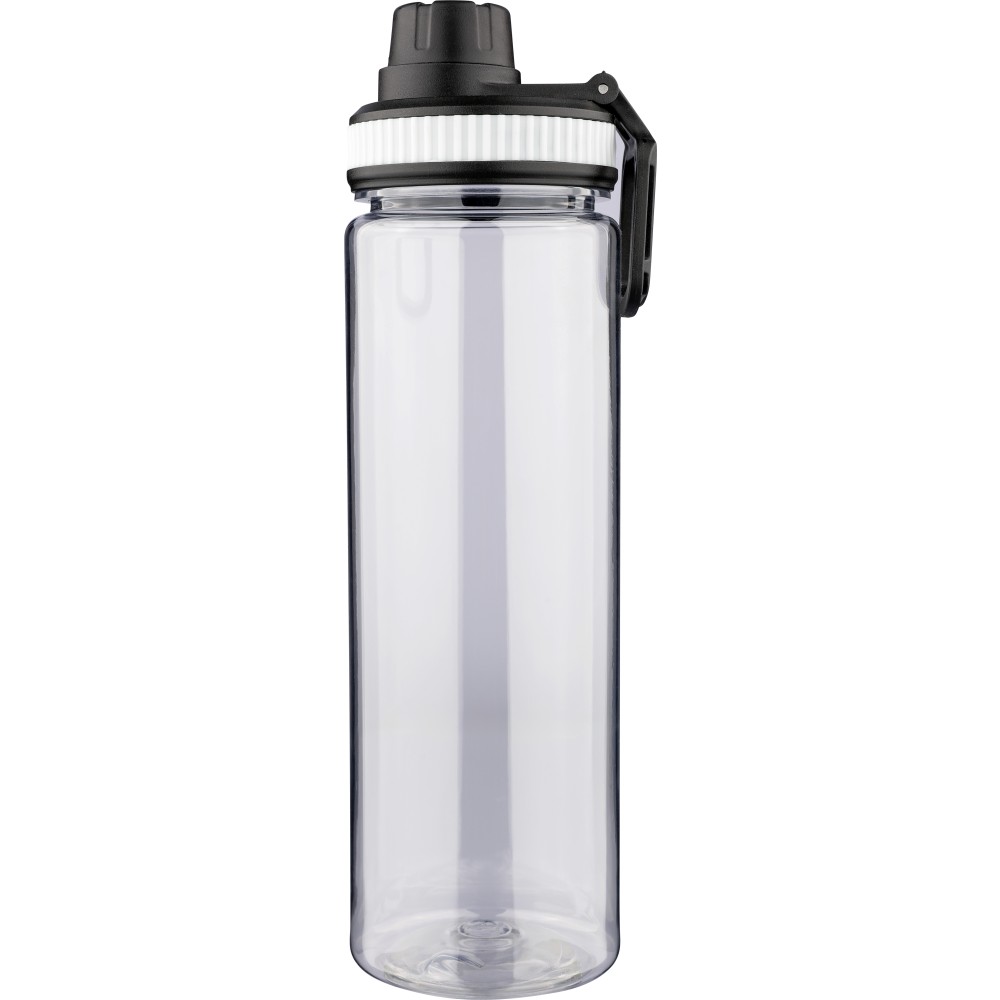 RPET anyagból készült ivópalack PP kupakkal, amely hordozófüllel és csavaros záródással rendelkezik, valamint a palack áttetsző testének színével harmonizáló szilikon díszítéssel. Űrtartalma 750 ml.