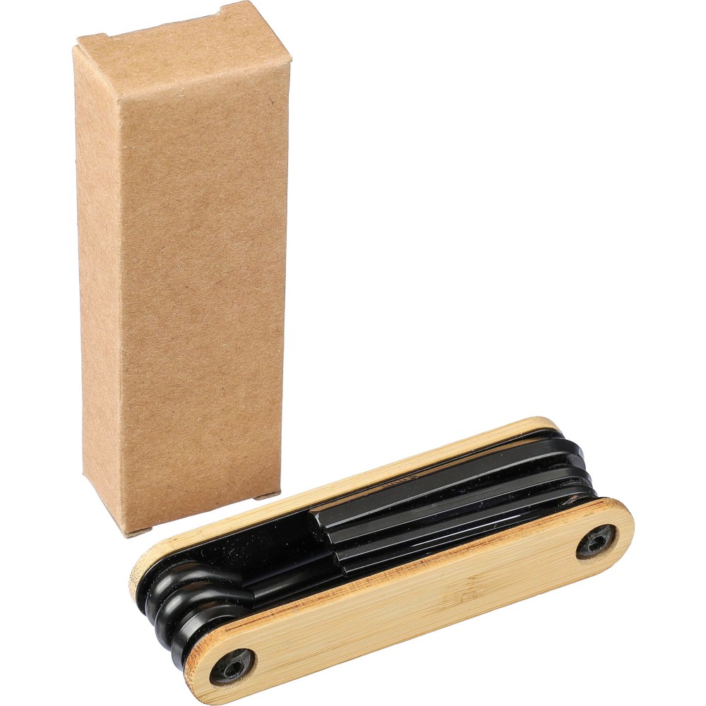 Szerszámkészlet bambusz részletekkel. 7 eszközt tartalmaz: imbuszkulcsok, Phillips csavarhúzó és laposfejű csavarhúzó. Egyenként barna kartondobozba csomagolva. Anyaga: szénacél.