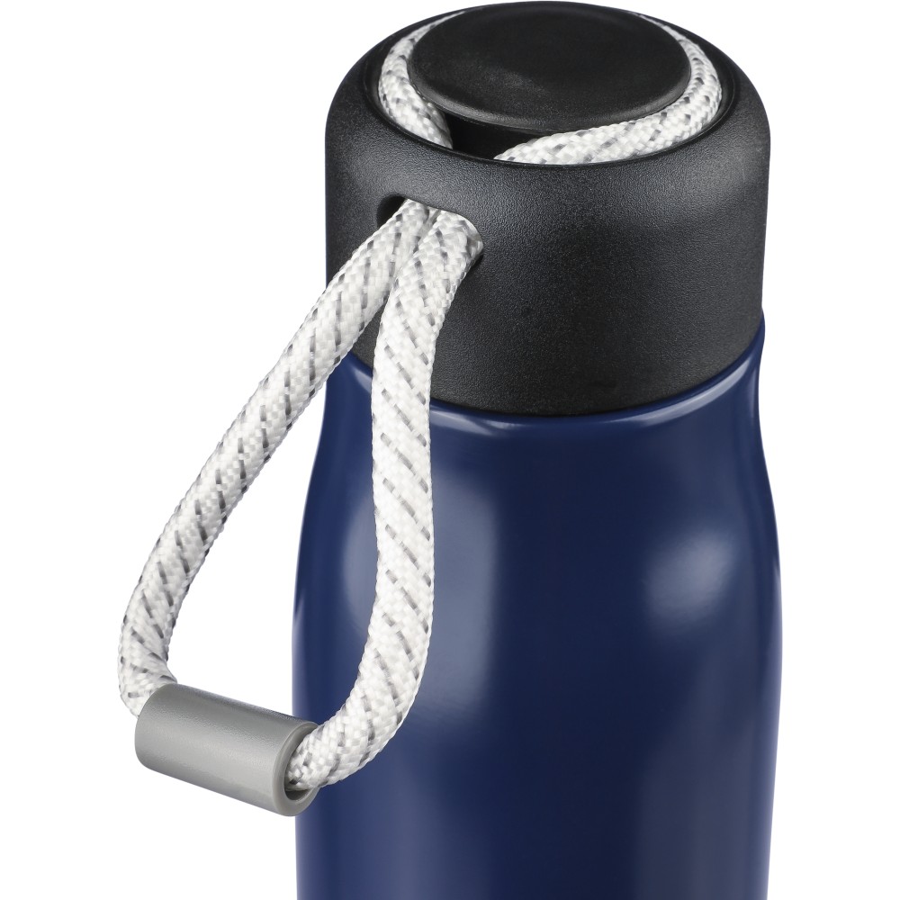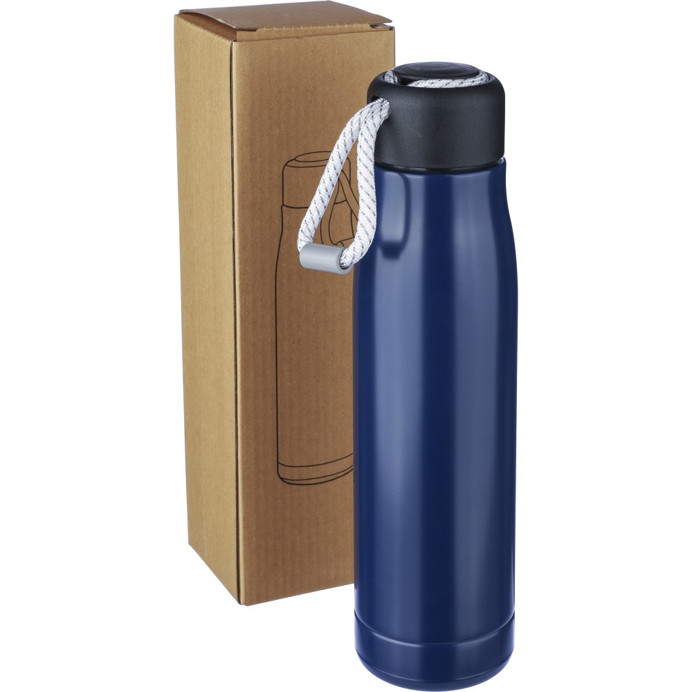 Újrahasznosított rozsdamentes acélból készült duplafalú, vákuumszigetelt termosz, 500 ml-es. Belseje 304-es, külseje 201-es rozsdamentes acél. Csavaros PP kupakkal, poliészter hordozópánttal. Hőszigetelésre és mindennapos használatra tervezve. Az újrahasznosított anyagra utaló gravírozott logóval. Csomagolása barna papírdoboz.