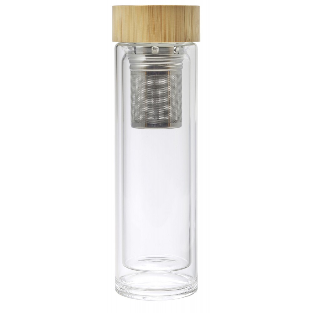 Duplafalú üveg bambusz kupakkal és fém teaszűrővel. Űrtartalom: 420 ml.